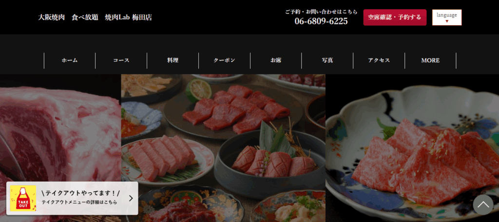 梅田エリアにある「焼肉Lab」は、コスパ良好な食べ放題が人気の焼肉店。スタンダードコースからA5ランク黒毛和牛が味わえるプレミアムコースまで幅広く展開しており、50種以上のメニューから選べるため、ボリュームも味も妥協したくない人に最適です。