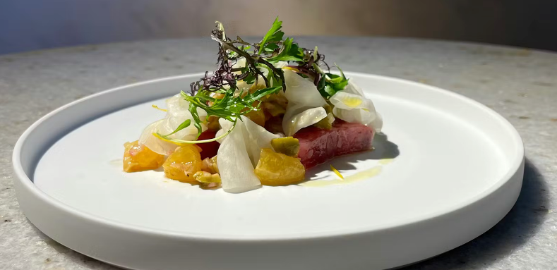 料理は、モダンなスペイン料理を軸にしながら、季節感や素材の持ち味を丁寧に引き出しているのが魅力です。淡路島の食材や北海道直送の魚介などを使った一皿、牛肉料理、お米料理まで幅広く楽しめるため、コースでもアラカルトでも満足しやすい構成になっています。