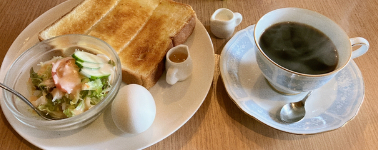 コーヒーはすっと飲みやすく、朝のスタートにも、仕事や用事の合間の休憩にもなじみます。モーニングはトーストやゆで卵など“喫茶店の定番”が揃い、気負わずサクッと満たされるのがうれしいところ。