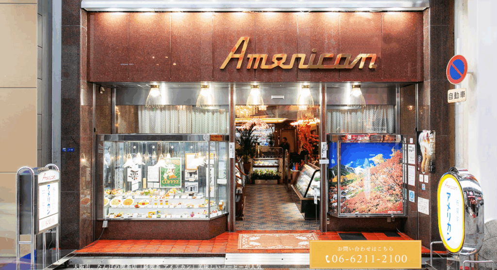 大阪・道頓堀に1946年創業という歴史を持つ純喫茶アメリカンは、昭和の雰囲気を色濃く残した老舗のモーニングスポットです。店内に入るとクラシカルなシャンデリアや螺旋階段、たっぷりと配された生花など、時間を忘れるような重厚な空間が広がります。