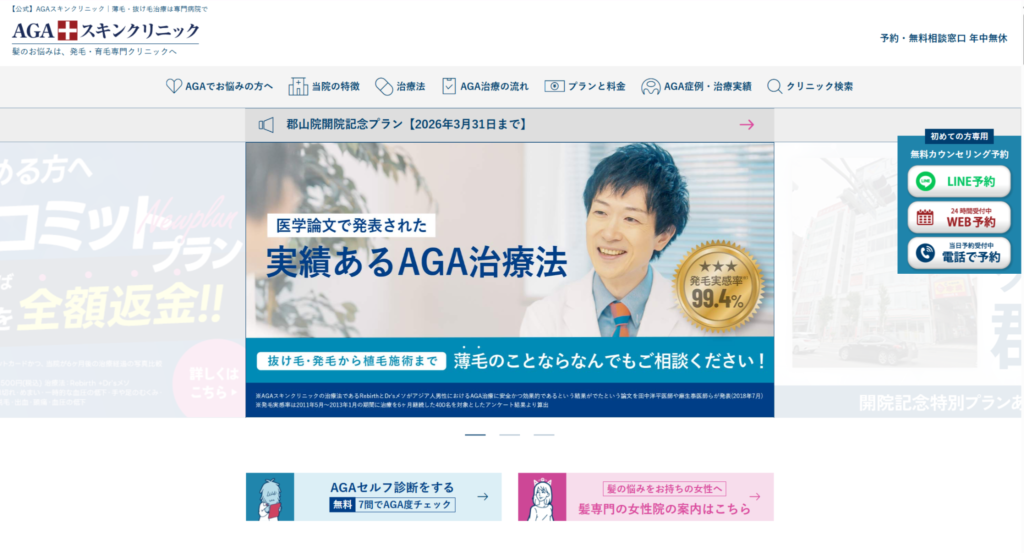 全国展開のAGA専門クリニックとして、症例数の多さが特徴です。内服・外用治療に加え、注入治療など複数の選択肢が用意されており、症状や希望に応じた提案を受けやすい体制が整っています。完全予約制・個室対応のため、落ち着いて相談しやすい点も支持されています。