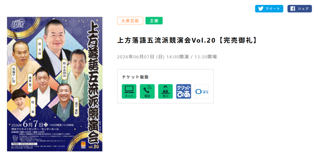 | イベント名 | 上方落語五流派競演会Vol.20 |
