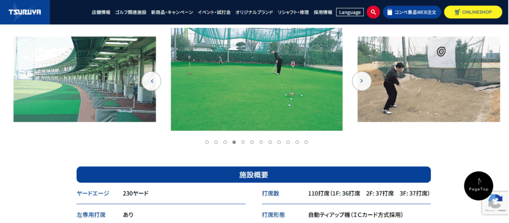 全国チェーンのゴルフショップ「つるやゴルフ」が運営する3階建て・110打席の打ちっぱなし施設。最大230ヤードの広々としたフェアウェイに加え、123ヤードのショートコースも併設しており、実戦経験を積みたい方にも最適です。