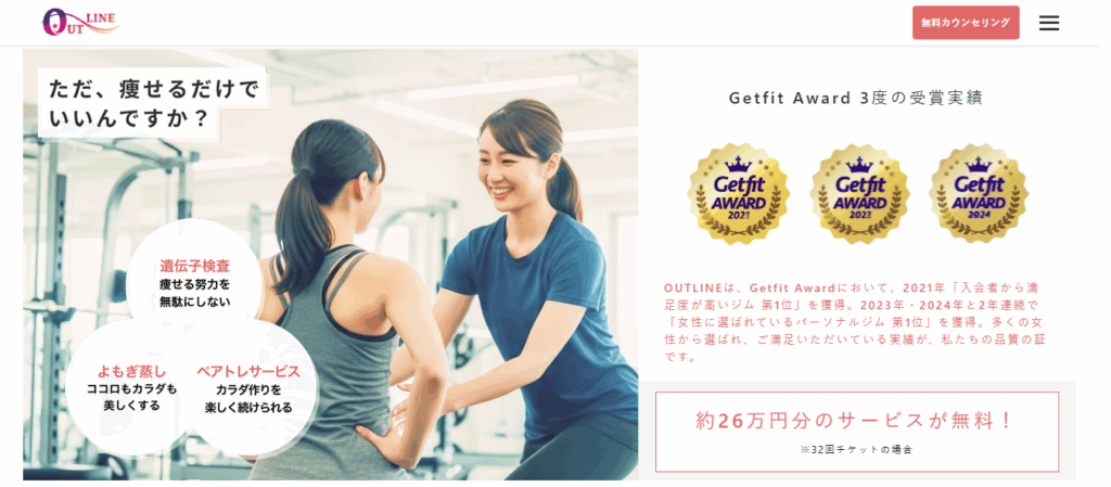 Getfit Award では「満足度の高いジム 第1位」「女性に選ばれているパーソナルジム 第1位」など複数受賞。手ぶら通いOK、ベビーサークル完備でお子様連れの方でも安心。まずは無料カウンセリングで雰囲気を確認するのがおすすめです。