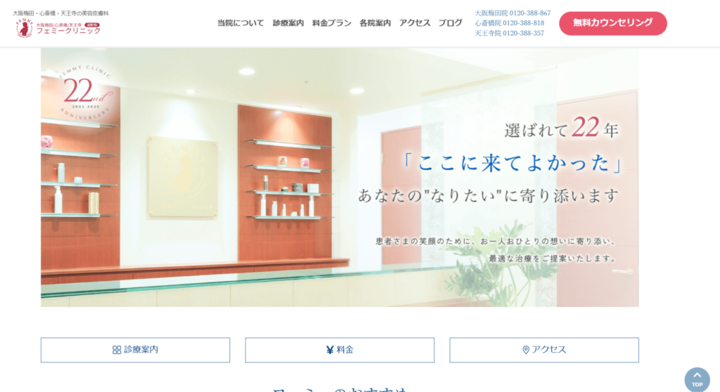 大阪で20年以上、信頼と実績を積み重ねてきた「美容皮膚科の老舗」です。 ただ毛を無くすだけでなく、カミソリ負けや肌荒れまで考慮した、医師による丁寧な肌診断が受けられるのが強み。複数の機械を組み合わせるオーダーメイド照射により、アトピー肌や敏感肌の方でも安心して「美肌」を目指せます。男性向けの「メンズフェミー」も根強い人気があり、頑固なヒゲに悩むビジネスマンの間で、朝の髭剃りが激変すると口コミが広がっています。