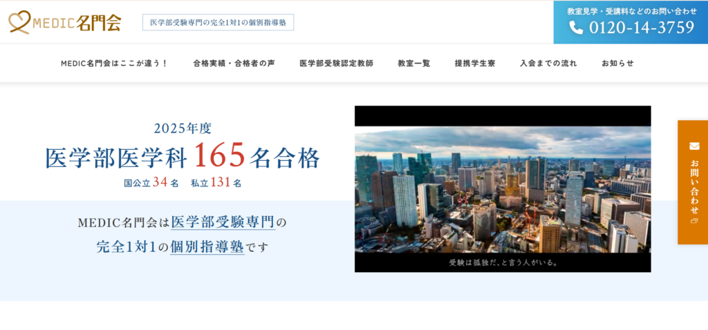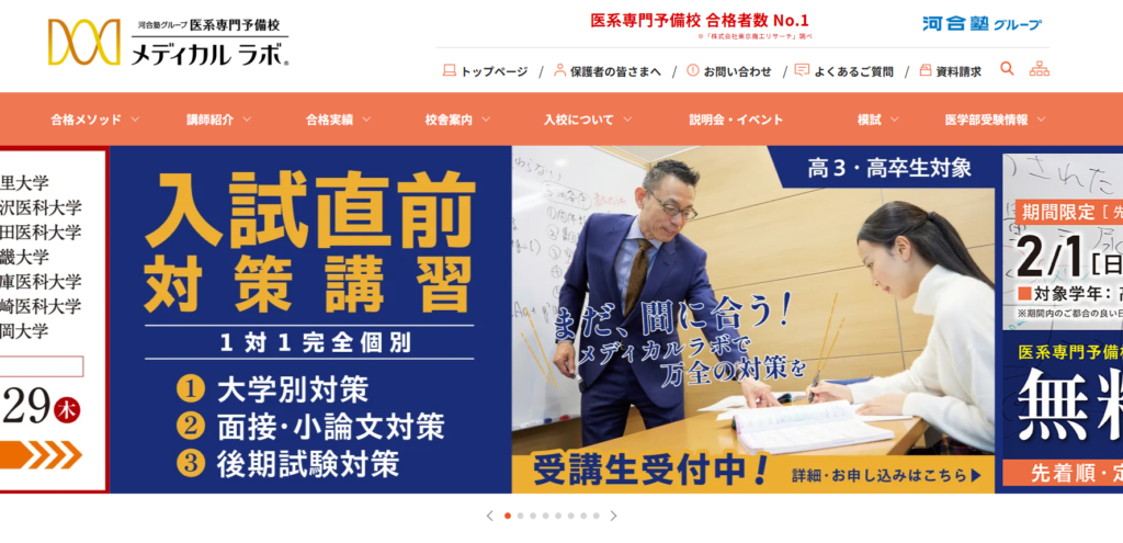 河合塾グループの医学部専門校です。プロ講師による完全1対1指導と、全国の入試データから相性の良い大学を導き出す「マッチング指導」が強み。駅直結で通いやすく、個別の学習管理で合格へ導きます。