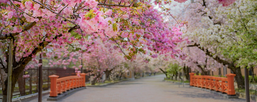 明治時代から130年以上にわたり愛されている、大阪の春を締めくくる特別な行事です。約560メートルにわたる旧淀川沿いの通路に、関山、普賢象、松月といった、他ではなかなか見られない希少な八重桜が100種類以上、約340本植えられています。一葉一葉が厚く、重なり合うように咲く八重桜はボリューム満点で、頭上に降り注ぐような「桜のトンネル」は息を呑む美しさです。日没後はぼんぼりによる灯りが灯り、ノスタルジックな雰囲気を演出します。毎年、その年を象徴する「今年の花」が選ばれるのも楽しみの一つです。