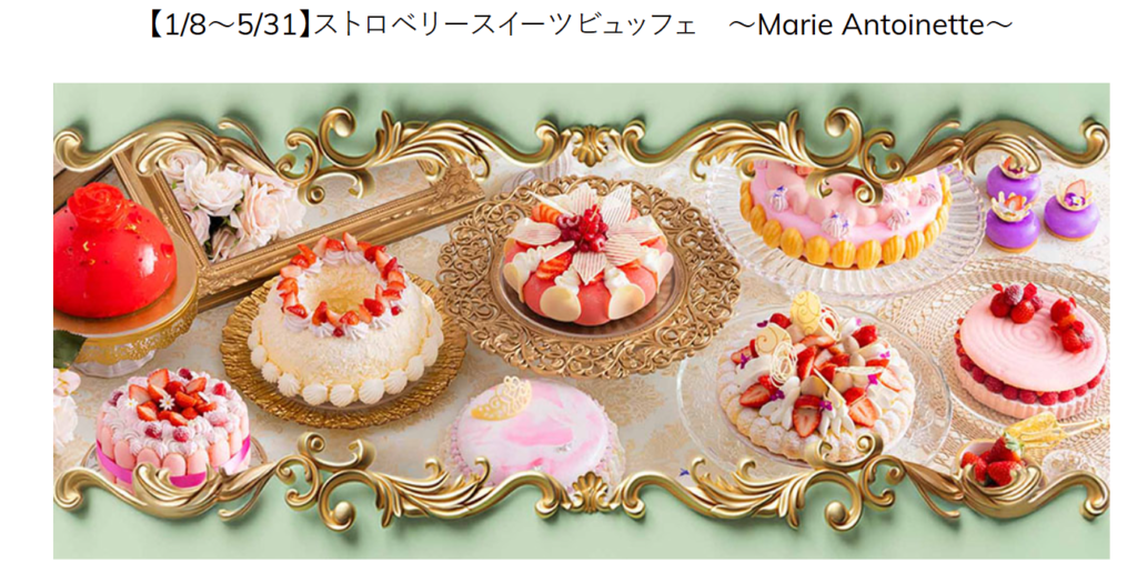 「ストロベリースイーツビュッフェ ~Marie Antoinette~」 ロココ調の優雅な世界観で、マリー・アントワネットが愛した宮廷をイメージ。ドレスや真珠をモチーフにした華やかなスイーツが並びます。