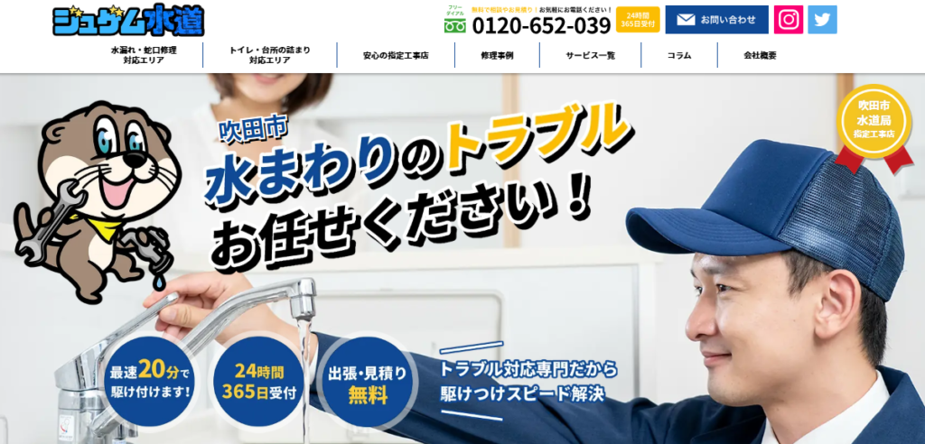 ジュゲム水道」は、吹田市や豊中市、茨木市などの北摂エリアを中心に、大阪・兵庫・京都・奈良で活躍する地域密着型の水道修理業者です。 最大の魅力は、地域を知り尽くしたスタッフによる「最短20分」という駆けつけスピード。