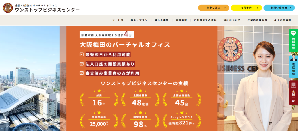 「ワンストップビジネスセンター」は、全国に拠点を展開する老舗のバーチャルオフィスです。 大阪梅田店は、西梅田駅から徒歩すぐの好立地にあります。