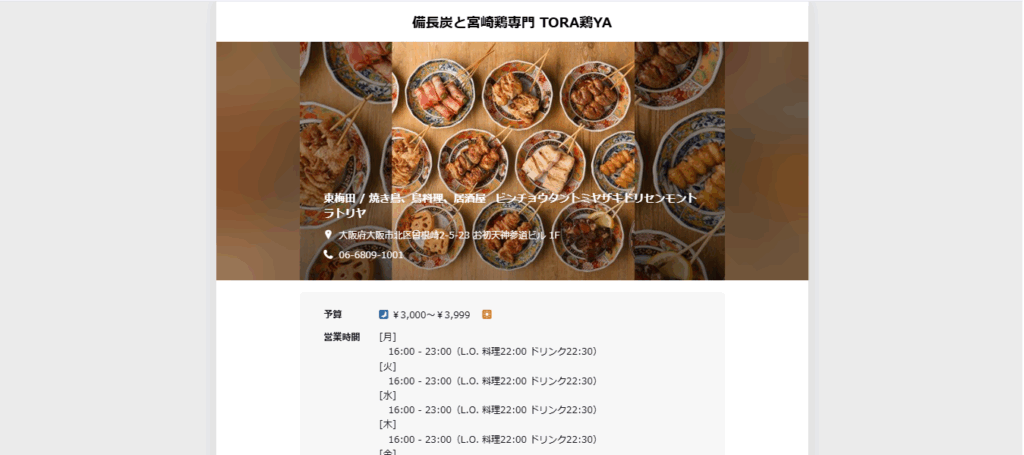 | 店舗名 | 焼き鳥 備長炭と宮崎地鶏専門 TORA鶏YA |
