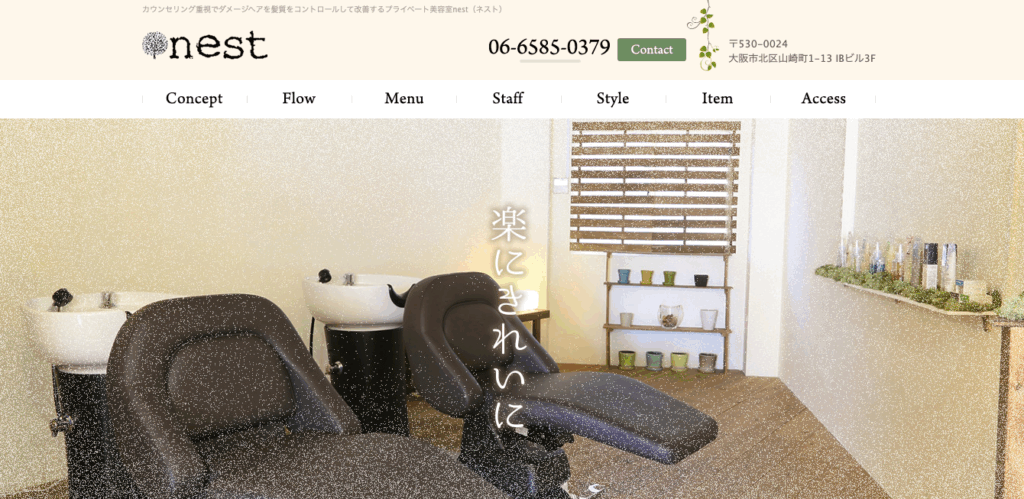 天満駅から徒歩3分、山崎町にある「nest(ネスト)」は、少人数制で落ち着いた雰囲気が魅力のプライベートサロン。マンツーマン対応を基本としており、最初のカウンセリングから仕上げまでを一人のスタイリストが丁寧に担当してくれます。