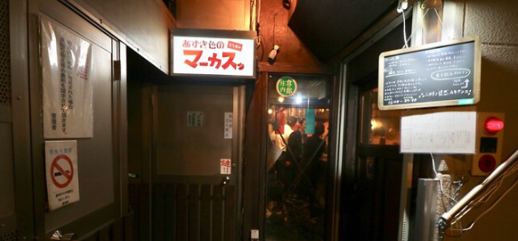 天満の立ち飲みシーンに新風を吹き込む、おしゃれ系立ち飲みの代表格「あずき色のマーカス」。店名の通り、店内は落ち着いた赤紫を基調にしたスタイリッシュな雰囲気で、女性一人でも入りやすいと評判です。