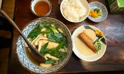 昆布と鰹の合わせ出汁は香り高く、天ぷらうどんやざるうどんなど定番に加え、季節限定のメニューも人気。落ち着いた店内は、ひとり時間にもぴったりで、昼夜問わず利用しやすい。派手さよりも味で勝負する、天満らしい職人の店です。