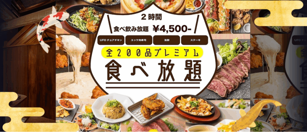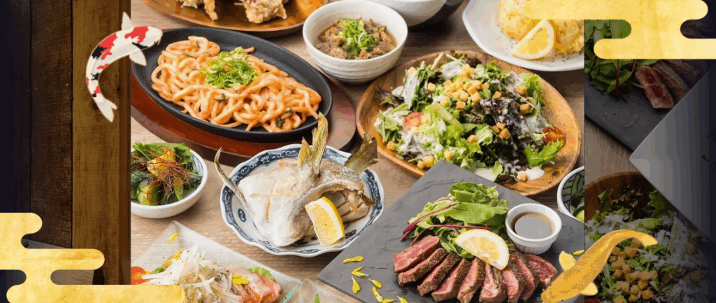 店内は全席個室仕様で、2名から利用可能。季節の食材を使った創作和食やイタリアンなどが食べ放題で楽しめ、ドリンクメニューも充実しています。コースは2,500円台からとリーズナブルで、誕生日や記念日の利用にも人気。
