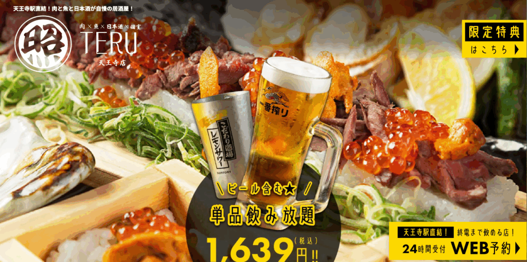 | 店舗名 | 肉とさかなと日本酒 照 TERU 天王寺店 |