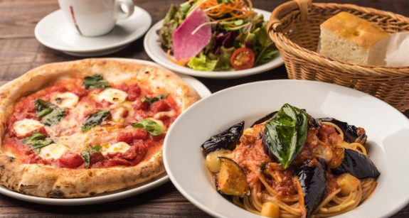 薪窯で一枚ずつ焼かれるピッツァは香ばしく、モッツァレラチーズのとろける食感が魅力。ランチタイムにはパスタセットやピッツァランチが人気で、休日はファミリーやカップルで賑わいます。