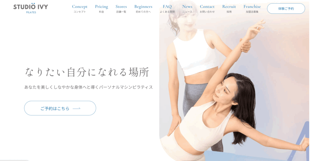STUDIO IVY 天王寺店は、天王寺駅から徒歩3分と通いやすく、完全少人数制のマシンピラティス専門スタジオです。全レッスンがリフォーマーを中心としたマシンを使用し、姿勢改善やボディメイクに特化したプログラムが組まれています。